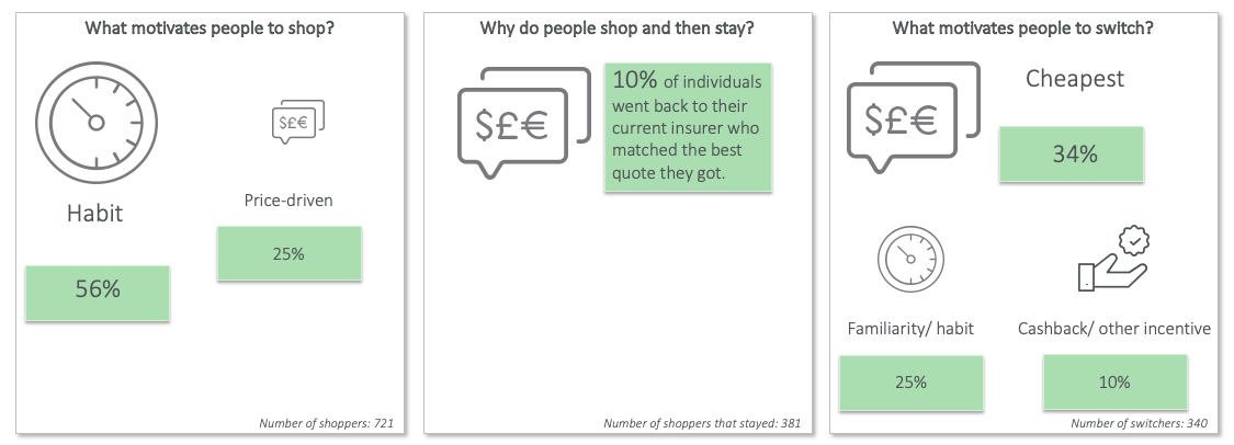 In Motor insurance, slightly more shoppers were price driven – 14% because their quote had gone up a lot at renewal and 13% who wanted to use a quote to renegotiate with their current insurer. A further 56% said they shop around each year on principle.
